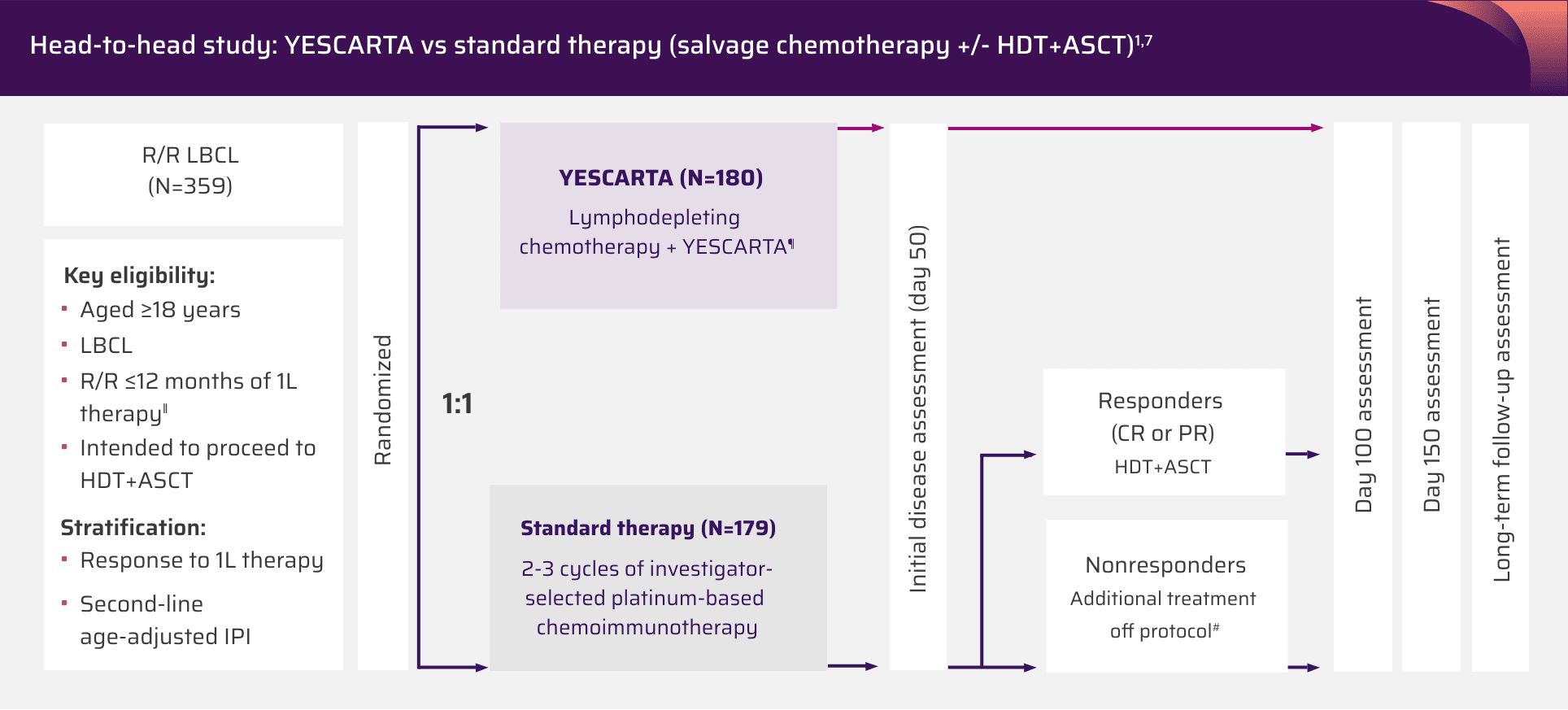 References: 1. YESCARTA® (axicabtagene ciloleucel). Prescribing information. Kite Pharma, Inc; 2025. 2. Westin JR, Oluwole OO, Kersten MJ, et al. Survival with axicabtagene ciloleucel in large B-cell lymphoma. N Engl J Med. 2023;389(2):148-157 (suppl). doi:10.1056/NEJMoa2301665 3. Ravi P, Kumar SK, Cerhan JR, et al. Defining cure in multiple myeloma: a comparative study of outcomes of young individuals with myeloma and curable hematologic malignancies. Blood Cancer J. 2018;8(3):26. doi:10.1038/s41408-018-0065-8 4. Patel AR, Ray M, Rodriguez-Guadarrama YA, et al. Statistical challenges from trials of potentially curative treatments: validation of cure assumptions when analyzing ZUMA-7 follow-up data of axi-cel and standard of care therapy. Blood. 2023;142 (suppl 1):6899. doi:10.1182/blood-2023-181255 5. Howlader N, Mariotto AB, Besson C, et al. Cancer-specific mortality, cure fraction, and noncancer causes of death among diffuse large B-cell lymphoma patients in the immunochemotherapy era. Cancer. 2017;123(17):3326-3334. 6. Maurer MJ, Ghesquières H, Jais JP, et al. Event-free survival at 24 months is a robust end point for disease-related outcome in diffuse large B-cell lymphoma treated with immunochemotherapy. J Clin Oncol. 2014;32(10):1066-1073. 7. Locke FL, Miklos DB, Jacobson CA, et al. Axicabtagene ciloleucel as second-line therapy for large B-cell lymphoma. N Engl J Med. 2022;386(7):640-654. 8. Locke FL, Miklos DB, Jacobson CA, et al. Axicabtagene ciloleucel as second-line therapy for large B-cell lymphoma. N Engl J Med. 2022;386(7):640-654 (protocol). doi:10.1056/NEJMoa2116133 9. Elsawy M, Chavez JC, Avivi I, et al. Patient-reported outcomes in ZUMA-7, a phase 3 study of axicabtagene ciloleucel in second-line large B-cell lymphoma. Blood. 2022;140(21):2248-2260. 10. YESCARTA® (axicabtagene ciloleucel). Biologics license application. Kite Pharma, Inc; 2021. 11. Westin JR, Locke FL, Dickinson M, et al. Safety and efficacy of axicabtagene ciloleucel versus standard of care in patients 65 years of age or older with relapsed/refractory large B-cell lymphoma. Clin Cancer Res. 2023;29(10):1894-1905. 12. Westin JR, Locke FL, Dickinson M, et al. Safety and efficacy of axicabtagene ciloleucel versus standard of care in patients 65 years of age or older with relapsed/refractory large B-cell lymphoma. Clin Cancer Res. 2023;29(10):1894-1905 (suppl). doi:10.1158/1078-0432.CCR-22-3136 13. Westin JR, Oluwole OO, Kersten MJ, et al. Survival with axicabtagene ciloleucel in large B-cell lymphoma. N Engl J Med. 2023;389(2):148-157. 14. Locke FL, Miklos DB, Jacobson CA, et al. Axicabtagene ciloleucel as second-line therapy for large B-cell lymphoma. N Engl J Med. 2022;386(7):640-654 (protocol). doi:10.1056/NEJMoa2116133 15. Data on file. Kite Pharma, Inc; 2024. 16. Locke FL, Miklos DB, Jacobson CA, et al. Axicabtagene ciloleucel as second-line therapy for large B-cell lymphoma. N Engl J Med. 2022;386(7):640-654 (suppl). doi:10.1056/NEJMoa2116133 17. Bell ML, Rabe BA. The mixed model for repeated measures for cluster randomized trials: a simulation study investigating bias and type I error with missing continuous data. Trials. 2020;21(1):148. 18. Detry MA, Ma Y. Analyzing repeated measurements using mixed models. JAMA. 2016;315(4):407-408.
