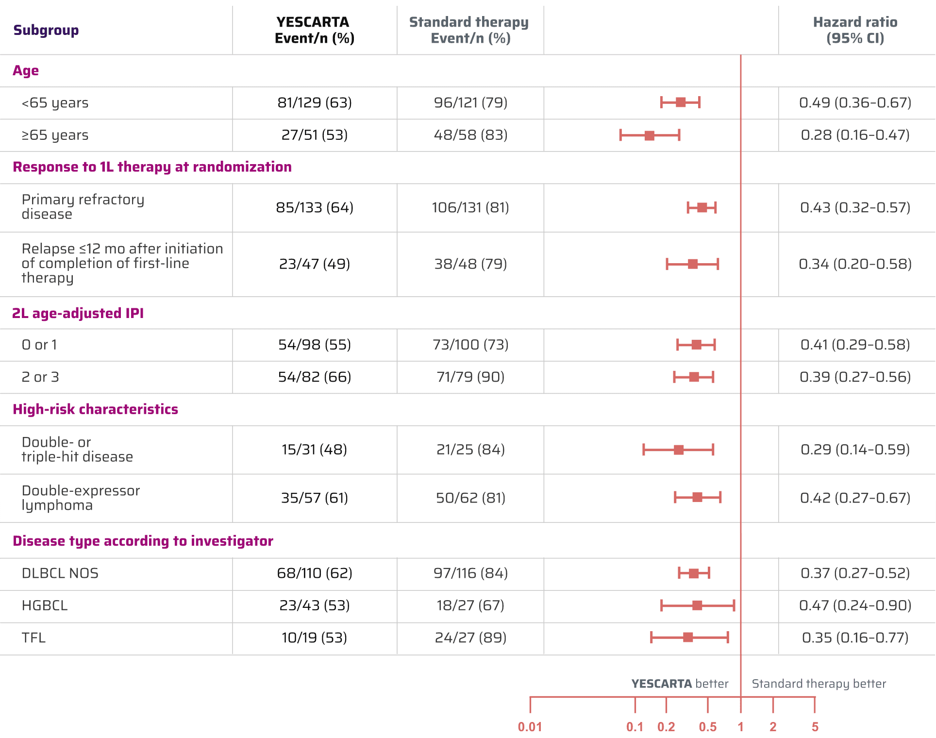 1L=first-line; 2L=second line; ALT=alanine aminotransferase; ASCT=autologous stem cell transplant; AST=aspartate aminotransferase; CAR T=chimeric antigen receptor T cell; CI=confidence interval; CR=complete response; CrCl=creatinine clearance; DLBCL=diffuse large B-cell lymphoma; DOR=duration of response; ECOG PS=Eastern Cooperative Oncology Group performance status; EFS=event-free survival; EORTC QLQ-C30=European Organisation for Research and Treatment of Cancer Core Quality of Life Questionnaire; HDT=high-dose therapy; HGBCL=high-grade B-cell lymphoma; HR=hazard ratio; HRQoL=health-related quality of life; IPI=International Prognostic Index; KM=Kaplan-Meier; LBCL=large B-cell lymphoma; LVEF=left ventricular ejection fraction; MID=minimally important difference; MMRM=mixed-effect models for repeated measures; NE=not estimable; NOS=not otherwise specified; NR=not reached; ORR=objective response rate; OS=overall survival; PFS=progression-free survival; PR=partial response; PRO=patient-reported outcome; R-DHAP=rituximab, dexamethasone, high-dose cytarabine, cisplatin; R-DHAX=rituximab, dexamethasone, high-dose cytarabine, oxaliplatin; R-ESHAP=rituximab, etoposide, methylprednisolone, high-dose cytarabine, cisplatin; R-GDP=rituximab, gemcitabine, dexamethasone, cisplatin; R-ICE=rituximab, ifosfamide, carboplatin, etoposide; R/R=relapsed/refractory; TFL=transformed follicular lymphoma.